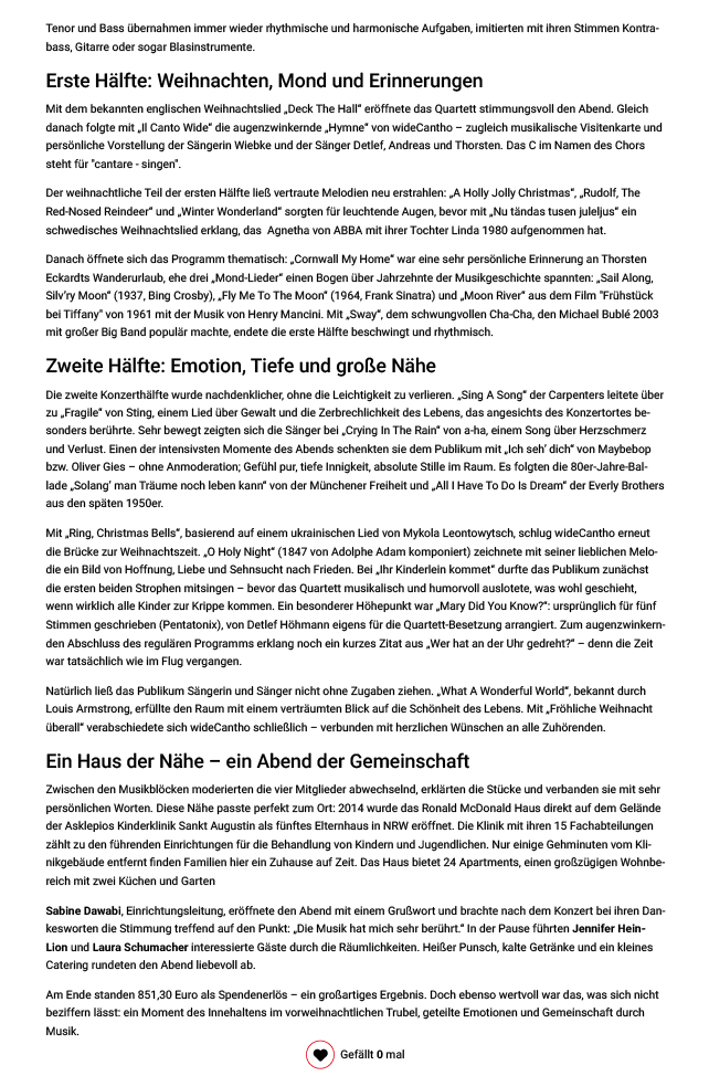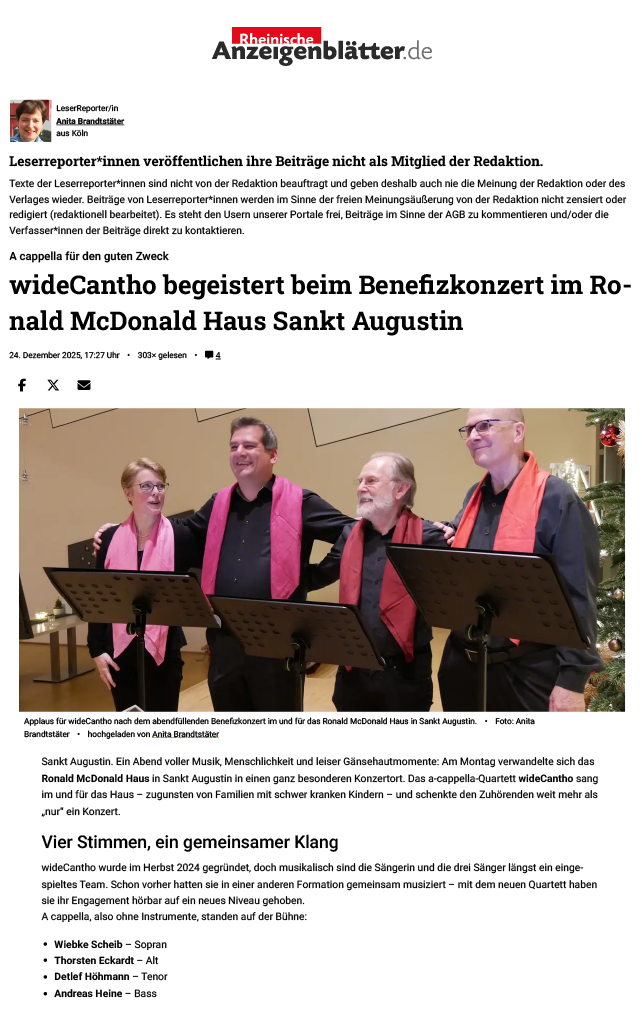 Am 24. Dezember 2025 berichtete das Extrablatt Sankt Augustin zuerst über unser Konzert im Ronald McDonald Haus an der Kinderklinik: