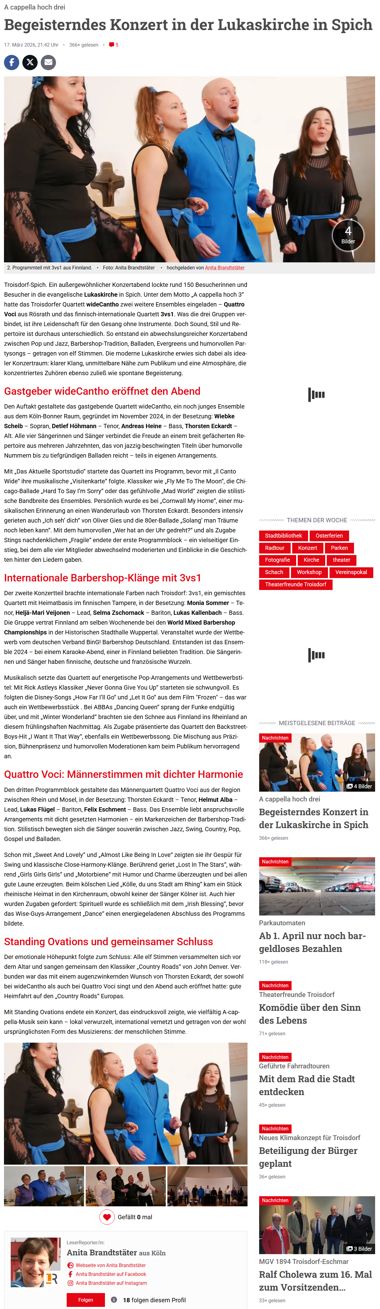 Das Troisdorfer Extrablatt veröffentlichte am 17.03.2026 einen Artikel über unser "begeisterndes" A-Cappella-Konzert am 15.03.2026: